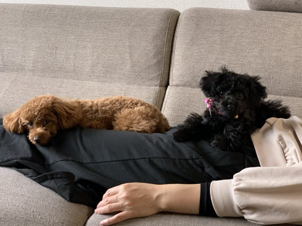 おなかの上でくつろぐ犬たち↓