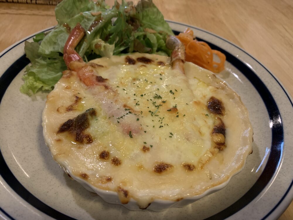 今日お昼に、カニグラタンを食べたカフェ、